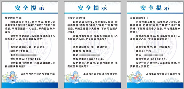 针对学生宿舍这一重点区域,学院组织辅导员和学生志愿者深入每间寝室,在门后位置张贴防诈骗安全提示贴纸,内容涵盖“刷单诈骗”“冒充客服”“虚假贷款”等常见骗局识别要点,确保学生随时可见、随时学习。