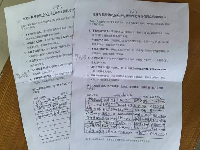 为强化学生自我防范的责任感,学院面向全体学生发起《yl6809永利YL集团班学生防范电信网络诈骗倡议书》签署活动,并召开主题班会等号召学生做到“不轻信、不透露、不转账”,并承诺主动学习反诈知识、积极向亲友宣传,同学们纷纷表示将从自身做起,坚决抵制电信诈骗。