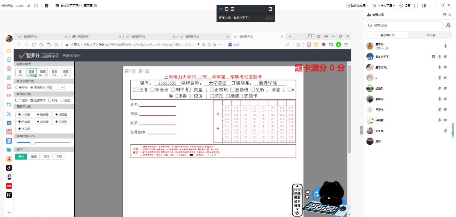 与公共课标准化试题不同,经管学院各个专业课程考核经常涉及到各类诸如全英文试题、会计分录题、大型案例分析、画图计算分析等复合题型。传统的公共课答题卡模板难以满足专业课程的需求。在答疑环节,针对上述情况,试点教师围绕答题卡的动态调整模块、题目图片识别、跨页答题衔接、全英文标题设置、留学生学号识别等具体问题和操作执行方式,与平台技术员展开了深入的交流探讨。