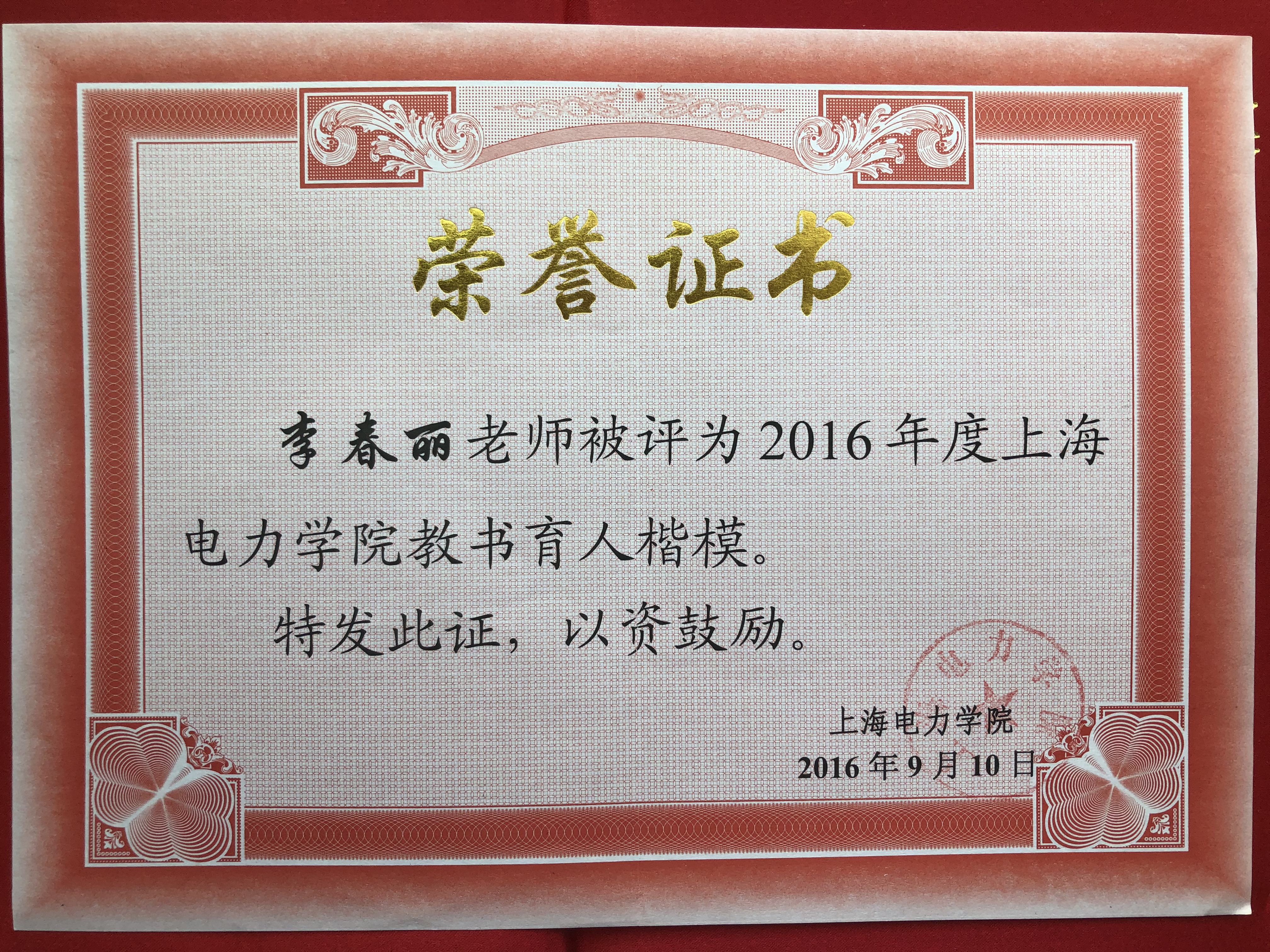 图5 李老师荣获yl6809永利集团教书育人楷模