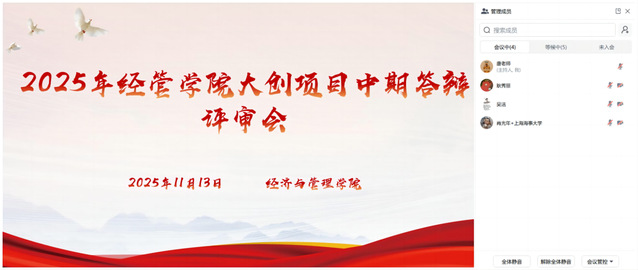 为了系统地评估大学生创新创业项目的阶段性进展情况,强化过程管理,提升创新创业项目质量,11月13日,经管学院对2025年立项的大学生创新创业项目组织进行了中期答辩评审会。上海市工程管理学会秘书长耿秀丽、上海立信会计学院金融学院副院长吴杰和上海海事大学经管学院副院长肖光年作为特邀校外专家参加本次评审会。