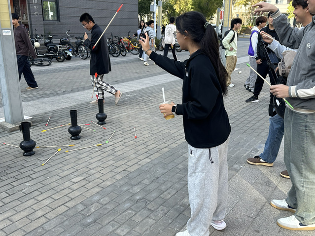 民族游戏区成为互动体验的热门打卡地。汉族传统游戏投壶趣味十足,在精准投掷中感受中华传统文化的雅致韵味;黎族跳竹竿则充满动感与协作性,师生们在欢声笑语中体验黎族人民的热情与活力,沉浸式感受传统游戏背后的民族智慧。