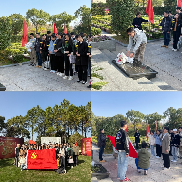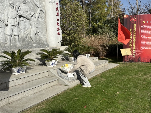 随后,全体人员前往书院烈士纪念碑。在庄严肃穆的氛围中,大家整队肃立,向革命烈士默哀致敬,表达对先烈们的深切悼念和崇高敬意。2025年上海市奖学金获得者陈诗婷作为代表,缓步上前,向革命烈士敬献花束,鲜花承载着全体人员对先烈们的无尽追思。大家纷纷表示,要传承先烈的英勇无畏精神,坚定理想信念,在新时代的伟大征程中,以实际行动为党和人民的事业添砖加瓦。
