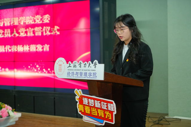 宣誓结束后,预备党员代表杨林茵上台发言,代表全体新发展党员表初心、立决心。她表示:“今日光荣迈入党员行列,我们必将以共产党员的最高标准严格要求自己,在日常学习生活中践行入党初心,在担当作为中履行誓言承诺,让青春在为国家、为人民的奉献中绽放璀璨光彩。”