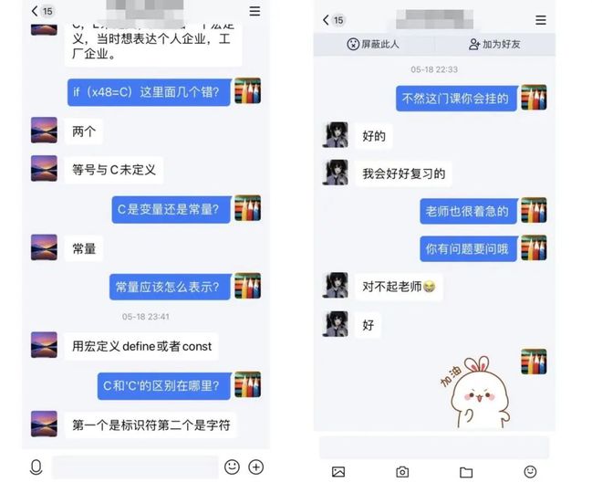 《程序设计基础》是一门实践性极强的设计课程,以培养学生程序设计的技能、规范、思维和解决实际问题的能力为目标,同时要注重学生的科学素养、创新精神的培养,因此在学生编程遇到问题时及时地答疑解惑是非常重要的一环。于是在叶文珺老师和学生们之间,经常出现深夜的师生互动场景。