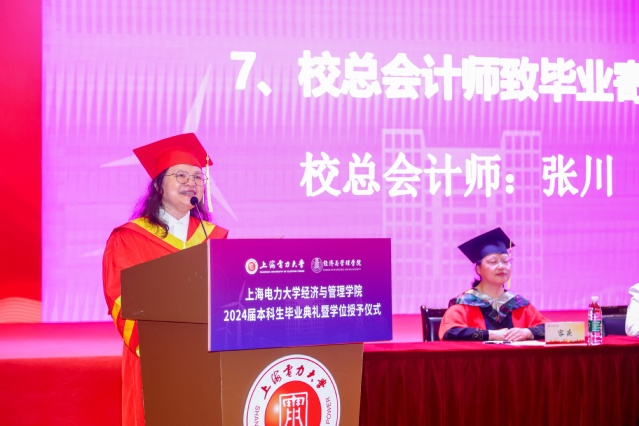 校总会计师张川教授为毕业生送出寄语祝福,她向圆满完成学业的毕业生们送上最热烈的祝贺,向为学生成长辛勤耕耘的老师和家长表示最衷心的感谢。对即将启程远航再出发的2024届本科毕业生们,他提出三点殷切嘱托:希望同学们路遥而不坠其志,要不畏艰难险阻。努力平衡,保持一颗有趣的灵魂,学会做减法,为攀登险峰“减负提速”。希望同学们行远而不改初衷,要不忘来时初心。把个人“小目标”融入党和国家的“大蓝图”,以青春之名,赴时代之约。希望同学们登高而不忘俯低,要不忘终身学习。心存敬畏、热爱生活,成就精彩人生!在接下来的人生漫长旅途中学会从挫折磨难中保持乐观豁达的态度,学会在逆水行舟中从内心迸发无穷的力量,乘风逐梦、踏浪前行。