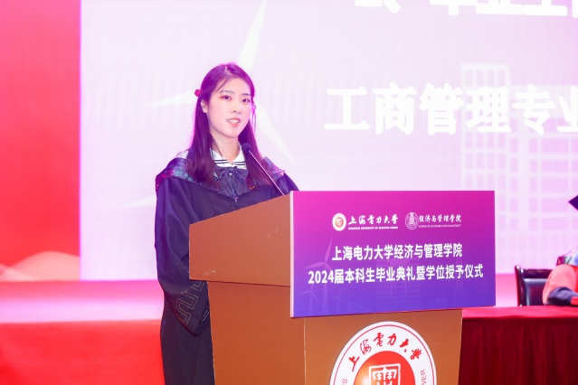 工商管理专业庞佳宁作为毕业生代表,深情回顾了在母校成长的经历,用成功和喜悦表达了对母校、老师和同学的感恩,鼓舞即将远航的上电经管少年牢记母校“爱国、勤学、务实、奋进”的校训精神,梦想的远征,没有捷径,努力定会取得进步。即将踏上新的征程,做拥有智慧并富有激情的人,做胸怀大志并脚踏实地的人,做富有责任并敢挑重担的人,在未来的旅途中追随光,成为光,发散光。