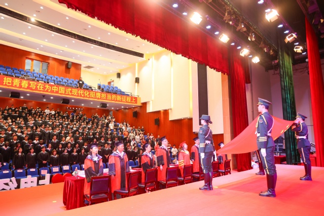 英姿飒爽、落地铿锵。典礼伊始,校国旗护卫队成员护送五星红旗缓缓入场。伴随着庄严的国歌声,毕业典礼拉开帷幕。