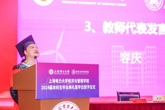 经管学院党委委员、优秀教师容庆作为教师代表发言,她深情地回顾了与学生们共同度过的美好时光,表达了对学生的殷切期望,希望经管学子追求高尚情操,清爽交往、踏实做事、本分做人;做终身学习的“能者”,升级思维模式的“智者”,打破常规束缚的“勇者”。