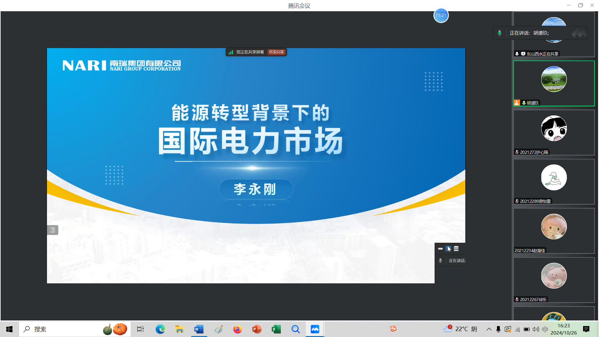 20241026日下午,应用经济系邀请南瑞集团电力市场首席专家李永刚,就能源转型背景下的国际电力市场这一主题进行线上讲座。近年来,全球电力市场化改革在不断向前推进,具体表现为电力市场个数越来越多,市场化区域越来越大,电力市场规则也越来越完善。以此为背景,讲座首先介绍一个比较典型的电力市场,着重介绍新型电力现货市场的一些关键要素,其次从几个不同侧面介绍国际电力市场的发展演变,接着再简要介绍一下电力市场监管的关键考虑因素,最后总结国际电力市场的未来发展方向。应用经济系师生参加了讲座,并在讲座结束后与主讲专家进行互动交流,通过讲座大家提升了对未来国际电力市场发展趋势的认识,取得了一定的收获。
