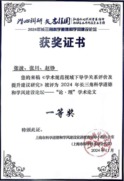 自《关于开展“2024年长三角科学道德和学风建设论坛”活动征集的通知》发布以来,学院广泛动员、精心组织广大师生参与投稿选拔。经个人申报、学院推荐、学术检测和论坛评审等环节,除张波获得一等奖外,研究生董真余撰写的《“工匠精神”传承与研究生学风建设路径探究和实践》论文获得优秀奖。