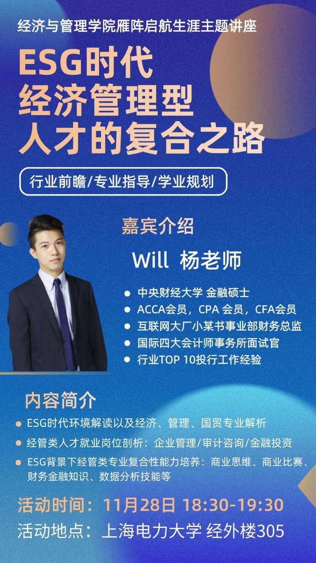 会上Will老师以《ESG时代经济管理型人才的复合之路》为主题,从“方向感”的角度向同学们介绍商科可从事行业与岗位解析,为同学们明晰未来的就业方向。从“问题解决能力”向同学们列举不同岗位的能力要求与晋升路径,为后续的职业规划打好基础。从“他律自律”的角度对同学们提出建议,鼓励同学们要努力提高学业绩点,在德智体美劳各个方面做好全面发展的准备,才能在后续的择业过程中有更多的选择。Will老师通过自身丰富的工作经验和前瞻性的行业见解为在场的同学们答疑解惑,同学们都积极互动,纷纷表示收获颇丰。