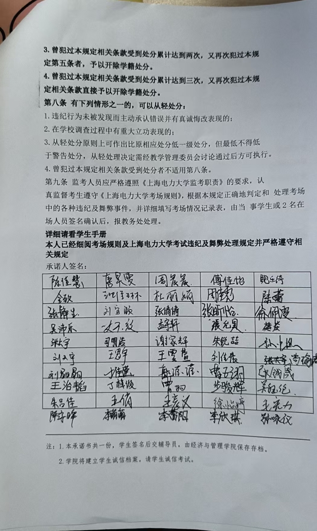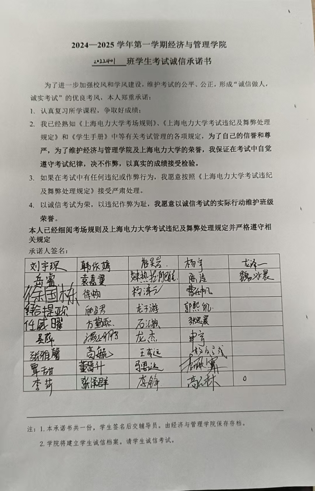 经管学院所有班级通过年级QQ群、班级群等网络媒介,在考前进行考试纪律和警示教育。同时安排班长、学习委员等班委、学生党员与班级学生进行诚信结对,进行诚信考试宣传和监督。所有班级全覆盖签署了考试诚信承诺书。