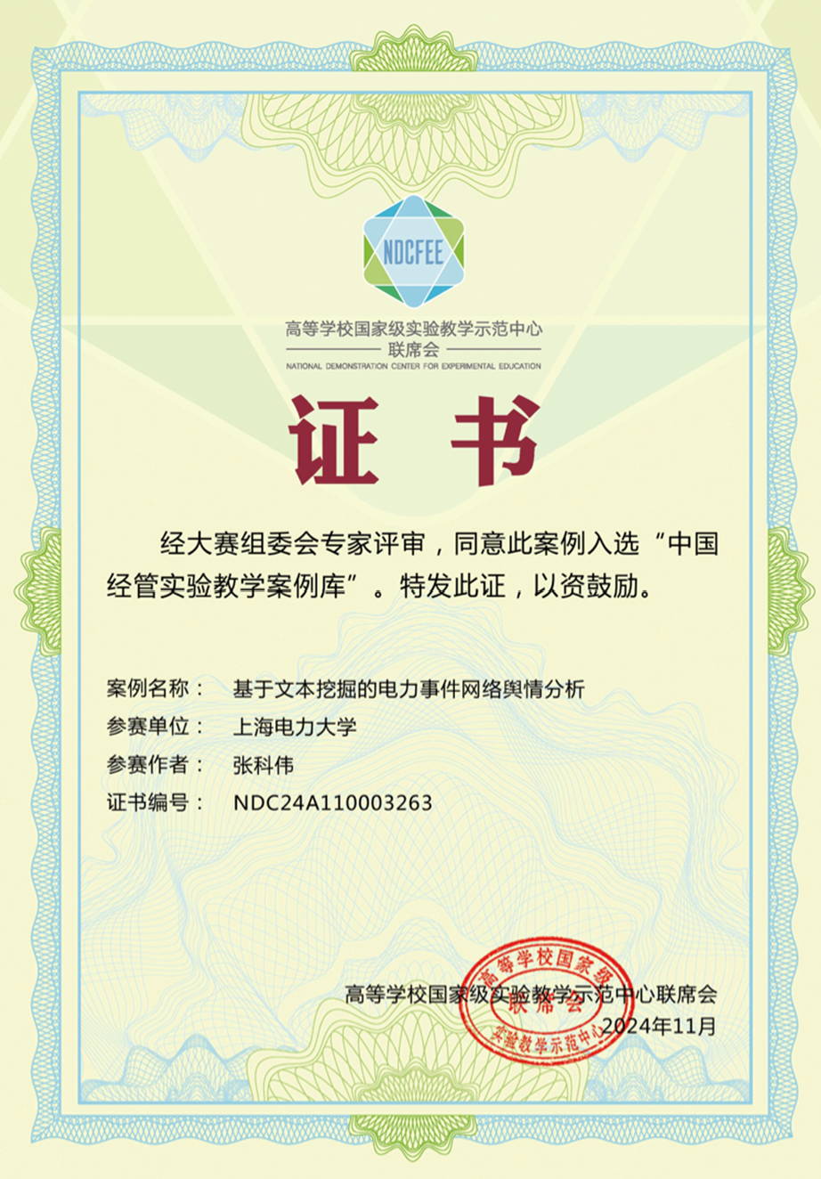 2024年9月21日,第七届“智享杯”全国高校经管类实验教学案例大赛华东区决赛在上海财经大学举办。我院管理科学与工程系张科伟教师撰写的《基于文本挖掘的电力事件网络舆情分析》实验教学案例荣获三等奖,并于11月成功入选中国经管实验教学案例库。