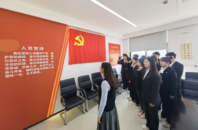在激昂的《国际歌》歌声中,入党宣誓仪式正式拉开序幕。周颖宣读新发展党员名单,并为他们佩戴党徽、颁发入党纪念册。随后,在领誓人王卲萱老师带领下,全体新发展党员面向党旗,高举右拳,庄严宣誓。入党誓词铿锵有力,那是一代代中国共产党人用生命、用意志、用奉献、用忠诚践行的对党的铮铮誓言。